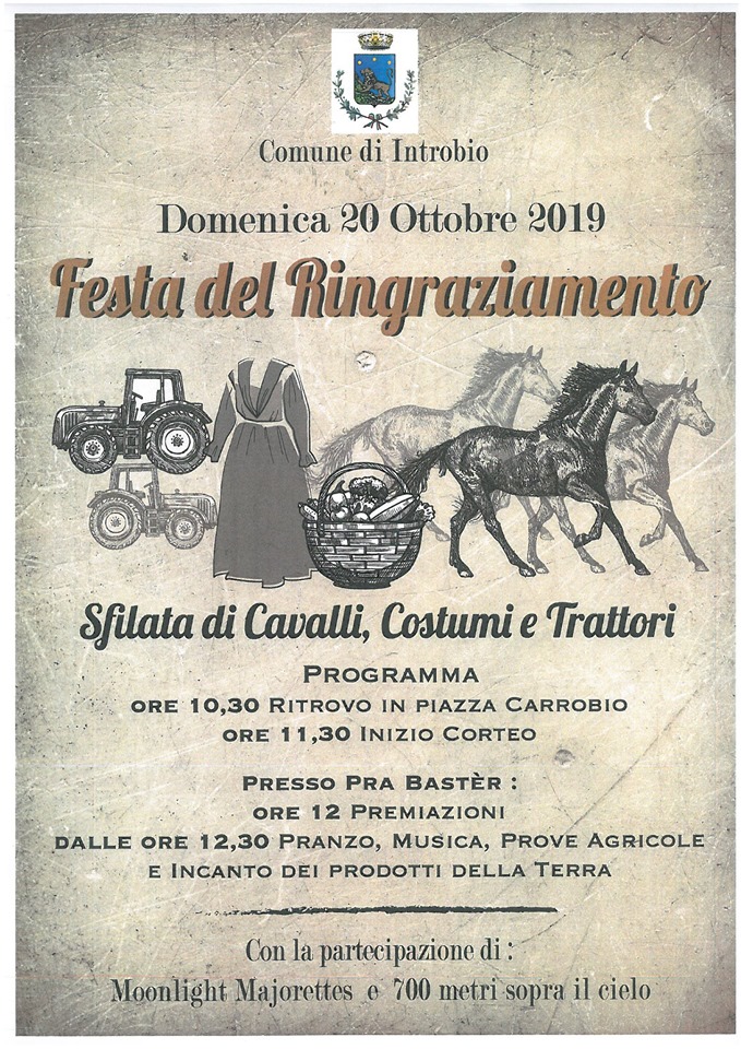Il giorno 20 ottobre a Introbio si terra' la Festa del Ringraziamento, con ritrovo in piazza Carrobbio alle ore 10.30 e inizio corteo.