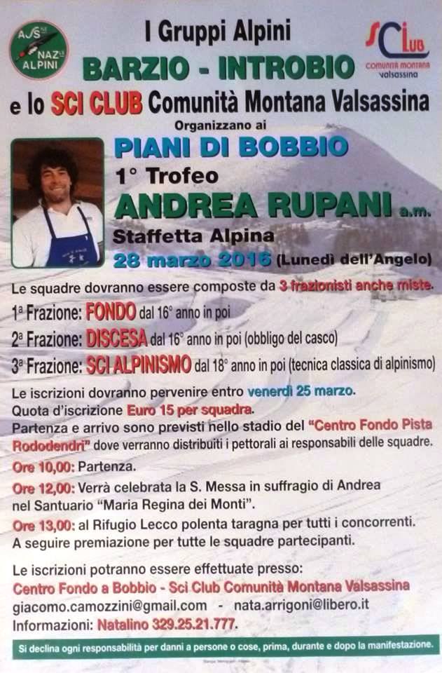 I Gruppi Alpini Barzio-Introbio e lo Sci Club Comunit� Montana Valsassina organizzano il 1� trofeo Andrea Rupani, staffetta alpina, nel luned� dell'Angelo. Fondo, discesa e sci alpinismo. Iscrizioni entro venerd� 25 marzo.