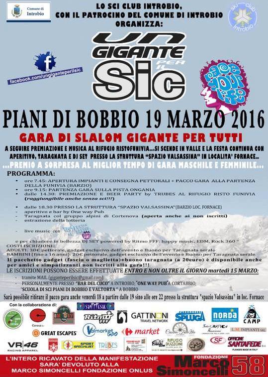 Lo Sci Club Introbio, con il patrocinio del comune di Introbio, organizza "Un gigante per il Sic", gara di slalom gigante per tutti. L'intero ricavato della manifestazione sar� devoluto alla Marco Simoncelli Fondazione Onlus.