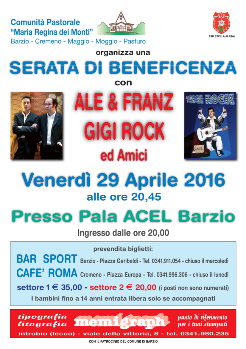 Serata di beneficenza con Ale e Franz, Gigi Rock ed amici presso il Pala Acel di Barzio. Prevendita biglietti presso il Bar Sport di Barzio e il Caf� Roma di Cremeno.